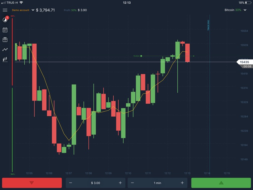 ราคา Bitcoin จะไปทางไหน ให้คลิ๊กทางนั้น เมื่อครบกำหนดเวลา จะได้รู้กัน ได้กำไรหรือขาดทุน การลงทุนบิทคอยน์ใน Binary option วันนี้ผลตอบแทนอยู่ที่ 30% ต่อการลงทุน 1 ครั้ง ถ้าลงทุนหลายครั้งจะได้รับผลกำไรหลายเปอร์เซ็นต์ แต่ถ้าขาดทุนจะสูญเสียเงินทุนในการลงทุนแต่ละครั้งไป